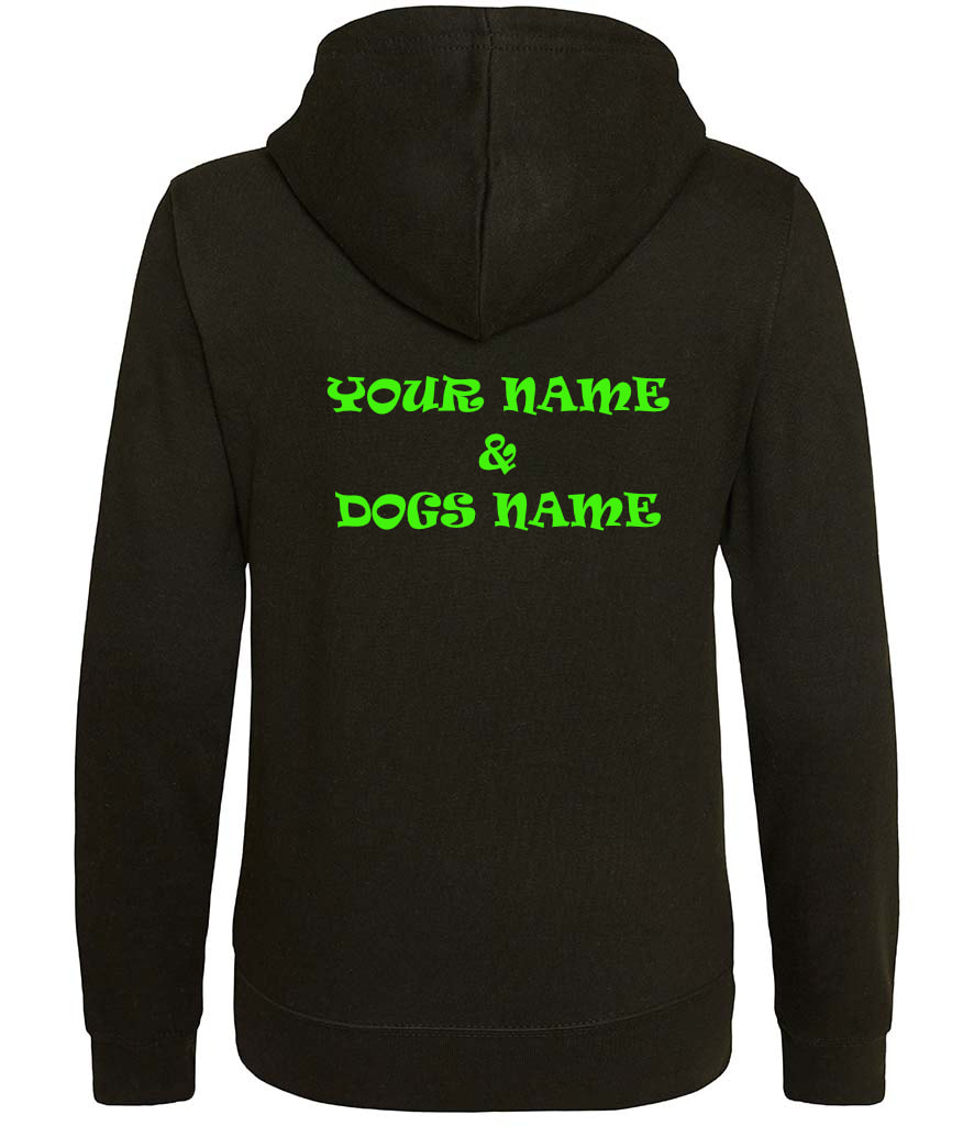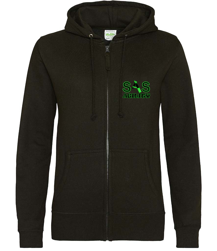SAS Agility Ladies zip up hoodie in Black. You have the option of adding your name and that of your dog(s) on the back.