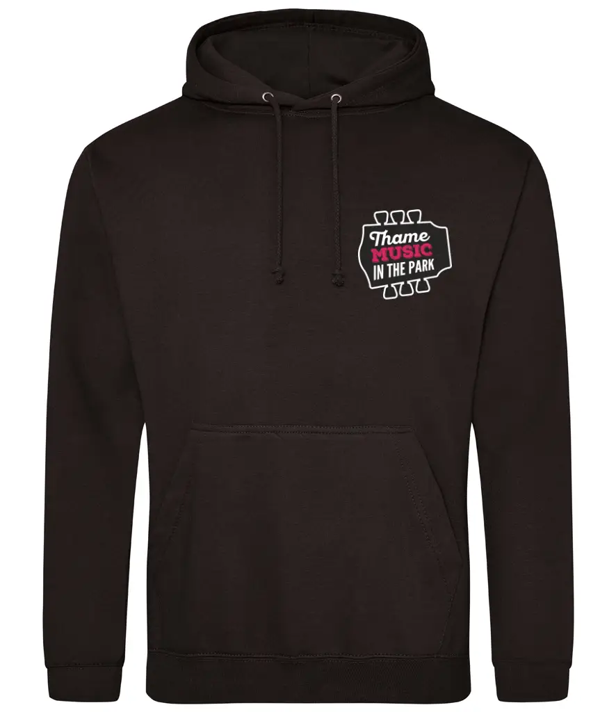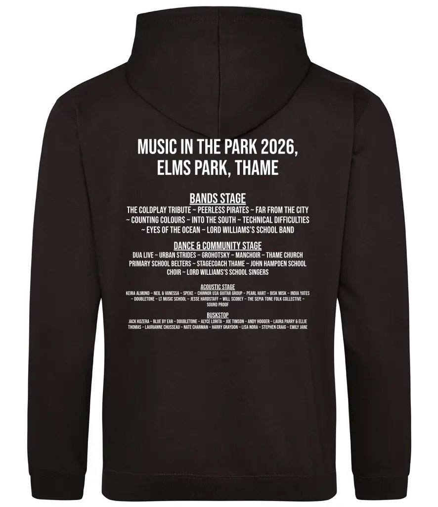 This cosy black hoodie features the Music in the Park logo on the front and the full lineup printed on the back — perfect for cooler evenings at the park or lounging after.